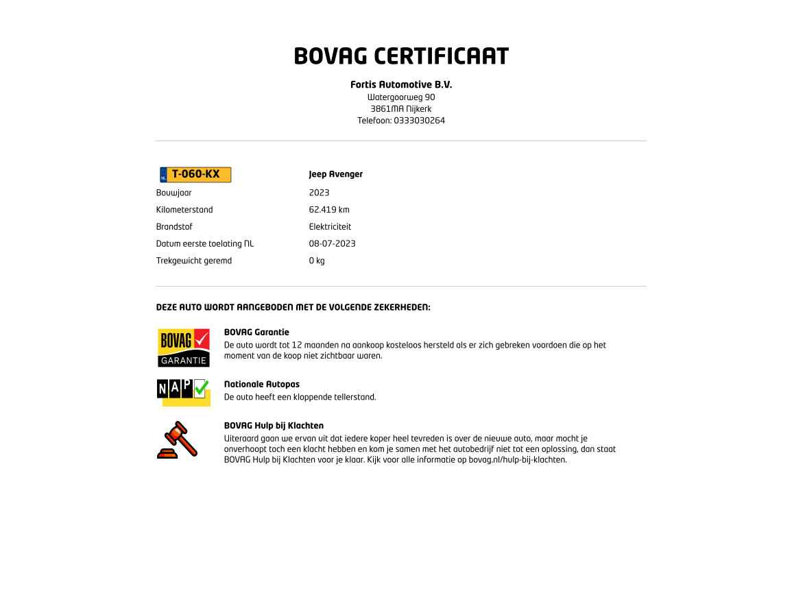 Met de Jeep Avenger kiest u voor het rijplezier van de toekomst. De volledig elektrische aandrijflijn zorgt voor krachtige prestaties en een sensationeel acceleratievermogen. Ervaar de kracht en stilte van de elektromotor tijdens het rijden. Stoelverwarming maakt deel uit van de rijke uitrusting van deze auto. Met een druk op de knop gaat de elektrische achterklep open. U wordt in deze auto ook getrakteerd op 18 inch lichtmetalen velgen, LED koplampen, extra getint glas, in delen neerklapbare achterbank en LED-achterlichten.